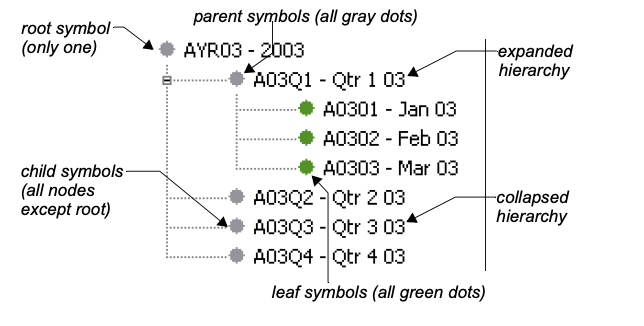 | Parent | A parent symbol has at least one child symbol beneath it in its hierarchy. The values of the child symbols determine the value of the parent. However, some parent symbols are static, and therefore their value is not specified by their child symbols. |