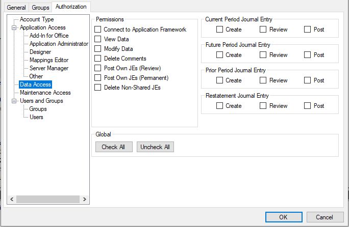 - Use the expandable hierarchy in the left panel to choose areas of functionality. Permissions for each category are listed in the right panel. Select or clear the appropriate check boxes to grant or deny permissions to the group.