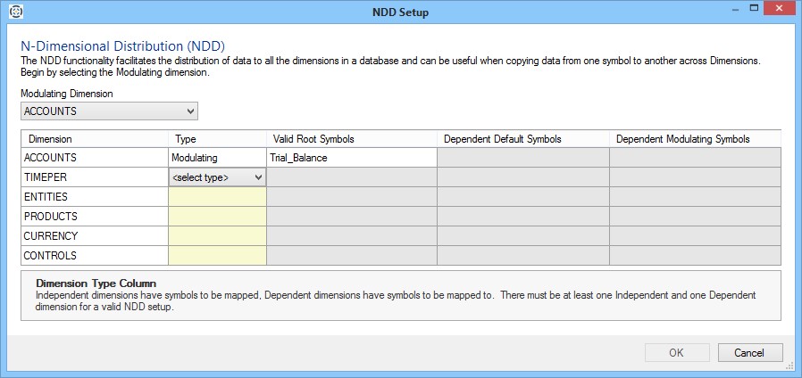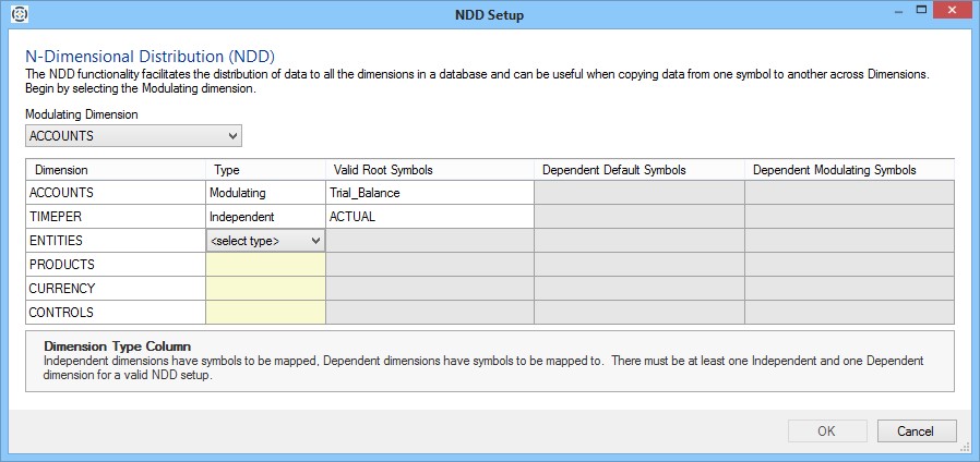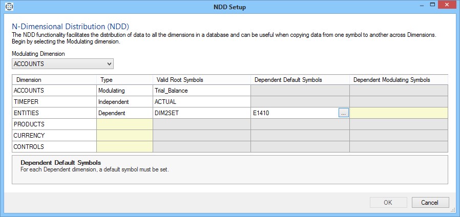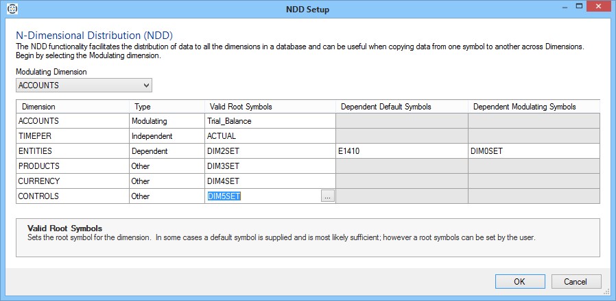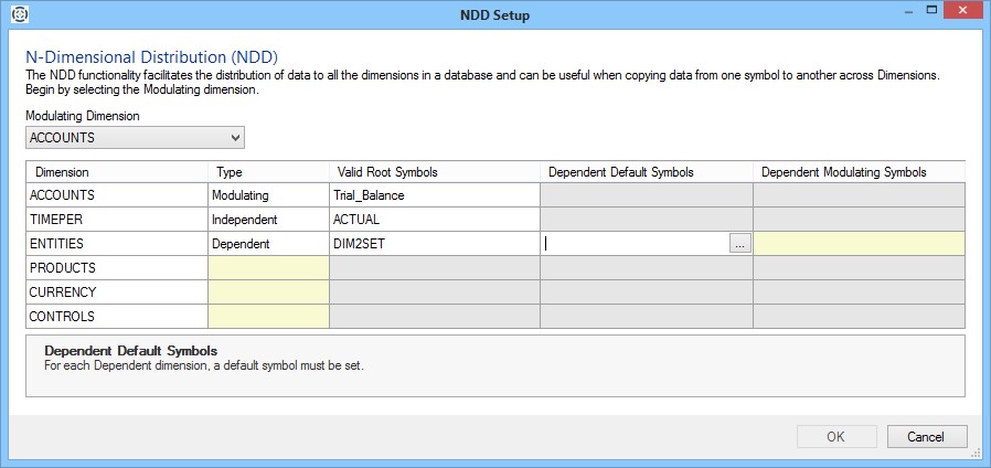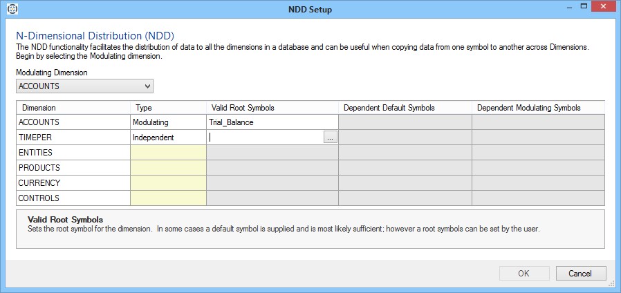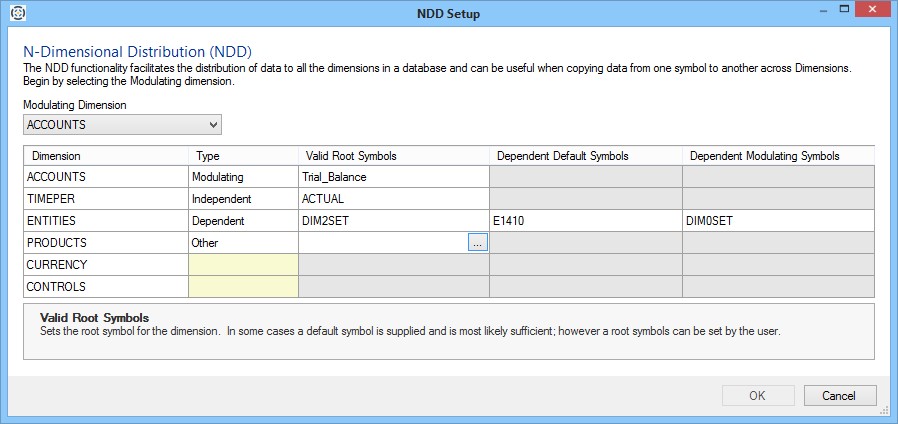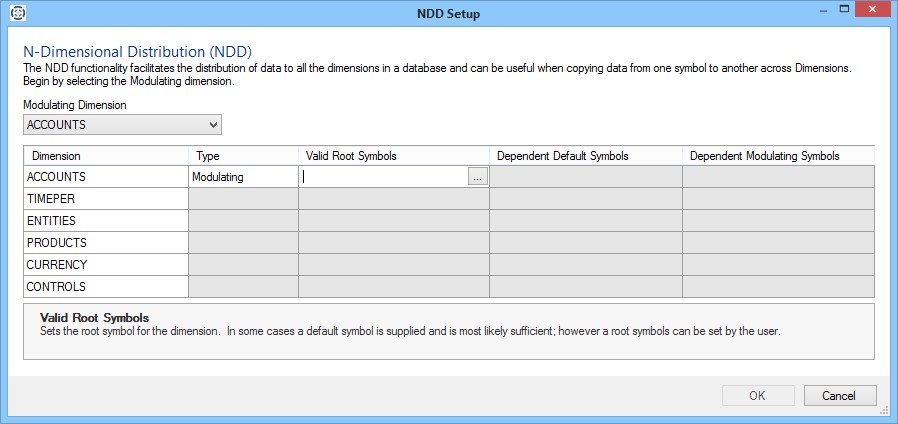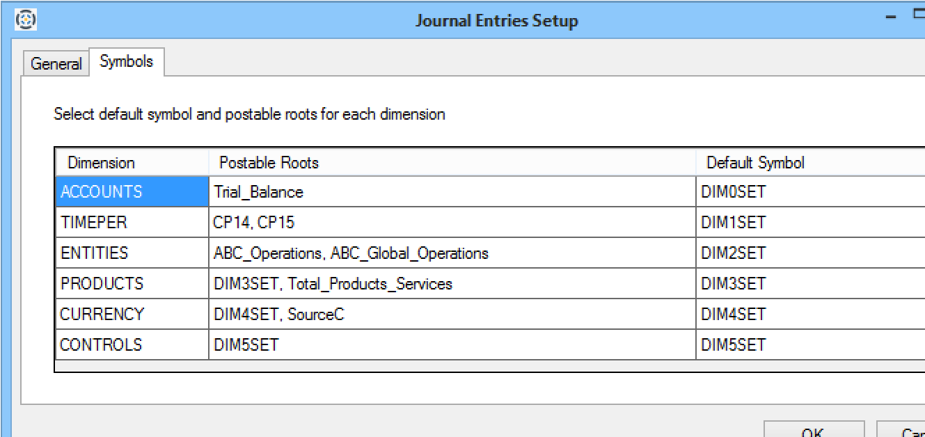 - Symbols: To specify a symbol for a dimension, click in the cell under the Symbol column for that dimension to activate a symbol selector button ( ... ). Click the button to view the Symbols dialog and use it to select a symbol for that dimension.