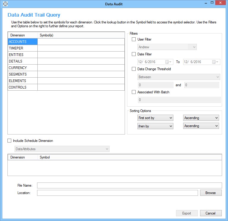 Note: The Export button is unavailable until the File Name and Location are entered.