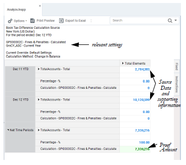 Supporting information changes depending on the settings used. For example, if the Actuals Calculation Method setting for this account for the selected entity had been Year-To-Date Balance, the prior year time period would not display in the app, since it would not apply. If the expected amount does not match the value in the analyzed cell, the proof amount displays in red.