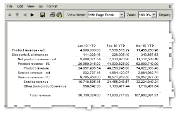 - When you are finished adding page breaks, select With Page Break in the View Mode drop-down list. The report appears in With Page Break mode, divided into the pages you defined.