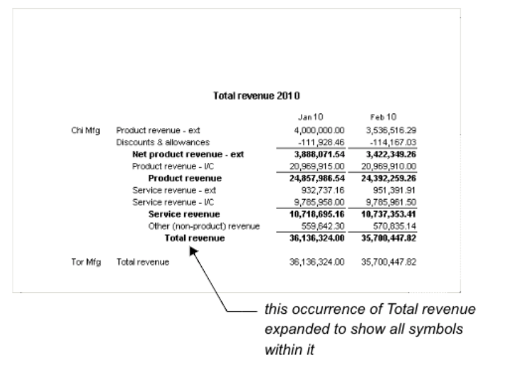You can expand and collapse hierarchies in the down and across dimensions of a report by clicking the plus and minus signs beside parent symbols, as described in Changing the level of symbol detail.