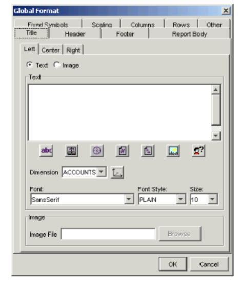 - In the report view, choose Format > Edit Global Format. The Global Format dialog appears, with the Title tab in view.