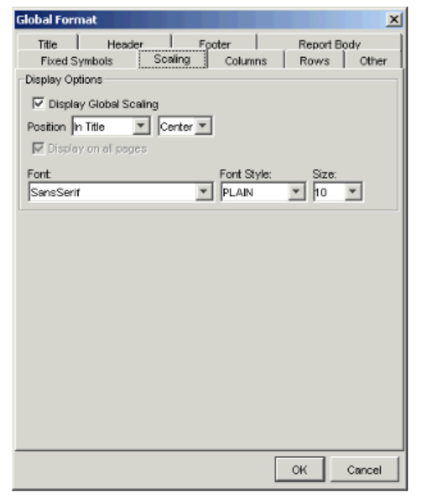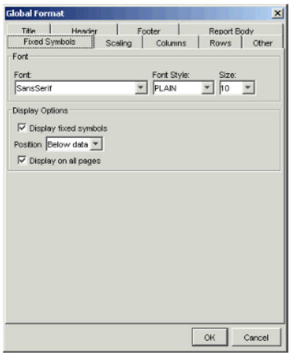 | body | The body of the report consists of the data. You can specify the font for data displayed. Also, you can choose to either include or omit fixed symbols in the report. |