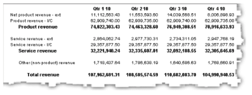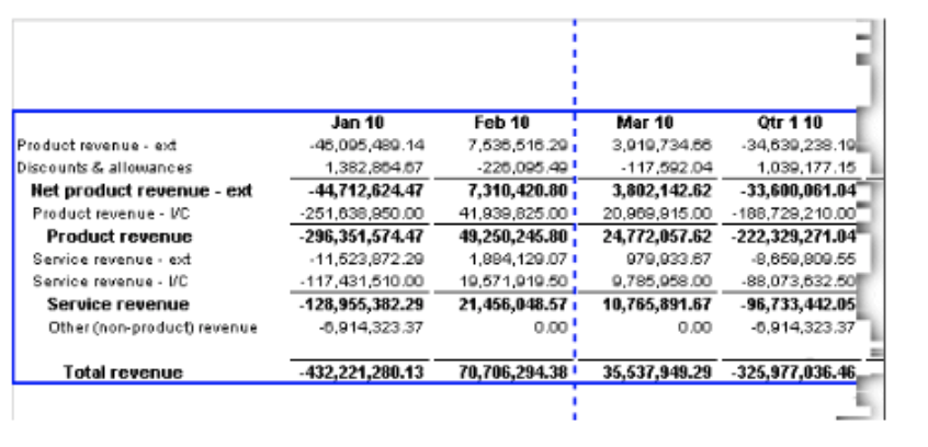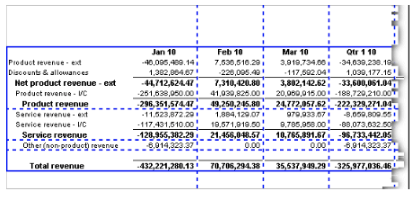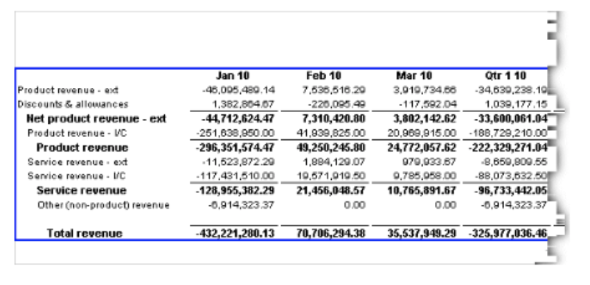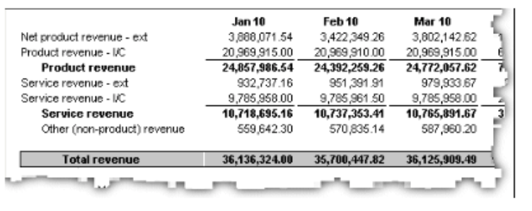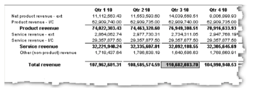 For example, in the following report, the cell containing total revenue for the third quarter of 2003 stands out from the rest of the report.