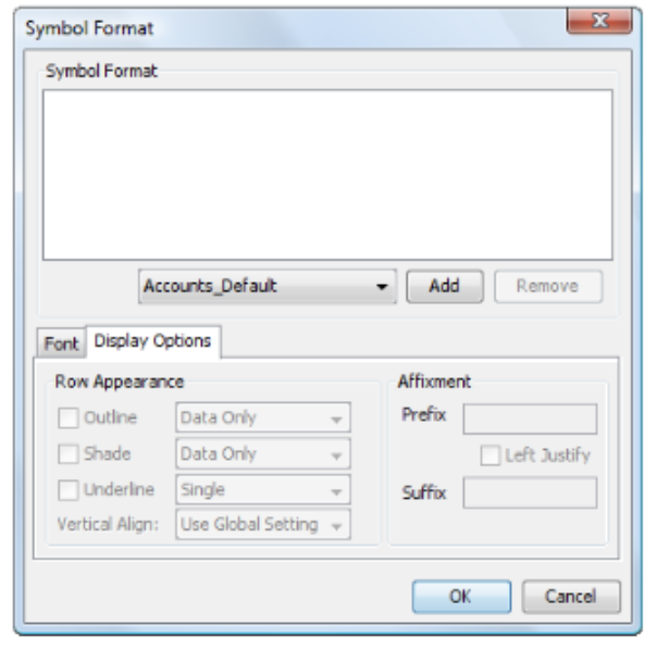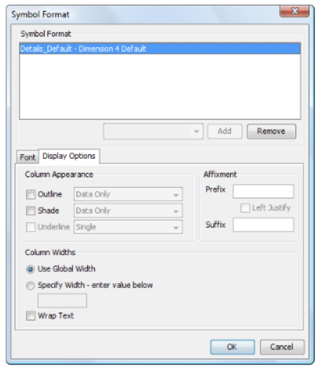 Prefix If necessary, type a character to precede the data in the cell. For example, you may want to place a dollar sign ( $ ) before the data. Left Justify Select this to left justify the prefix within the cell. This is useful if you want to align the prefixes in the report. If you do not select this, the prefix appears immediately to the left of the first digit in the value. Suffix If necessary, type a character to follow the data in the cell. For example, you may want to place a percent sign ( % ) after the data. If you are editing the format of a column symbol, the Vertical Align option is not available and additional fields are available under Column Widths.