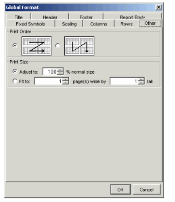 Depending on your role and the properties of the template, you may be able to specify the order in which the pages of a report are printed — either from left to right, or top to bottom. Also, you can specify whether the entire contents of the report fit onto one page or not. Settings in this dialog are automatically used for printing Web reports and templates.