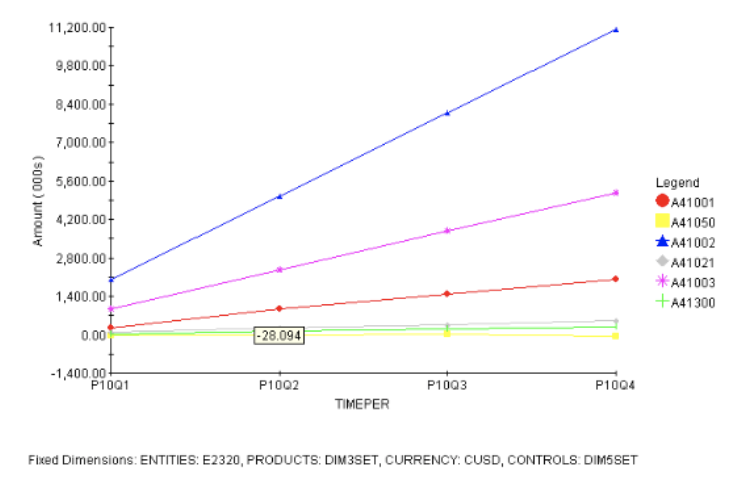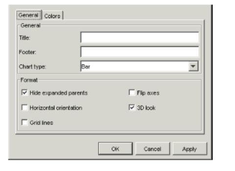 Field Description Hide expanded parents To hide the parent symbol in an expanded hierarchy. Horizontal orientation To display the chart horizontally. Grid lines To include grid lines in the chart. Flip axes To switch the position of the axes in the chart. For example, if the chart shows ACCOUNTS down and TIMEPER across, select this field to switch them. 3D look To display the chart in three-dimensional format. - Click the Colors tab.