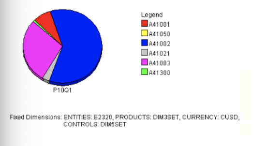 A pie chart is a chart in which each symbol in the down dimension appears as a sector of a circle, in proportion to its share of the total parent value (the total value of the pie). When you view data in pie chart format, you see one pie for each symbol in the across direction.