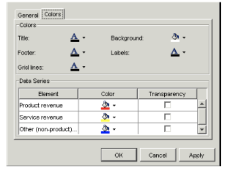 Field Description Title Select a color for the title. Footer Select a color for the footer. Grid lines Select a color for the grid lines. Background Select a color for the background. Labels Select a color for the chart’s labels. - For the Data Series section, you can select a color for each symbol in the down dimension of the chart. To make the color for a symbol transparent, so that you can see the symbols behind it, select Transparency.