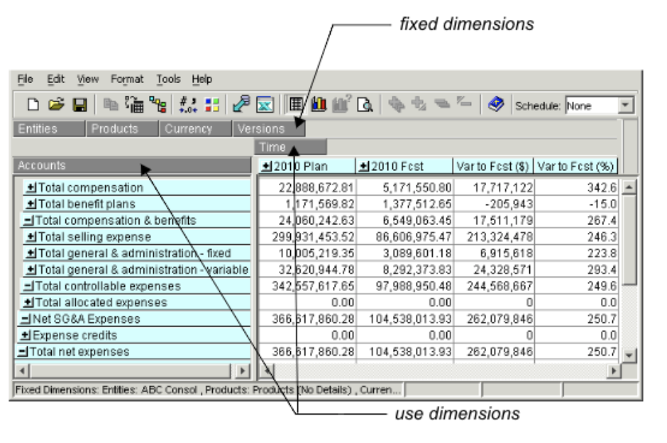 - The use dimensions are those that are visible in either the down or across directions of the template or DataView. You can choose to display as many symbols as you want in these dimensions. Also, you can have more than one dimension in the down and across directions at the same time.