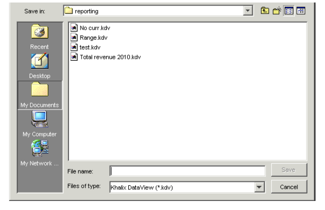 Field Description Save in Select the folder in which you want to save the DataView. The default is the reporting folder. Files of type Select DataView (.kdv). File name Type a name for the DataView. - Click Save. The DataView is saved.
