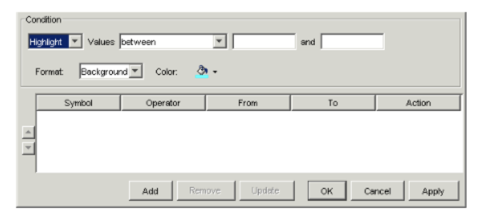 Field Description Top left drop-down list Select one of the following: - Highlight: To highlight the cells containing data meeting the condition.