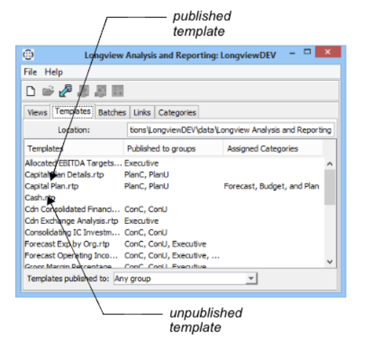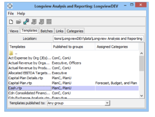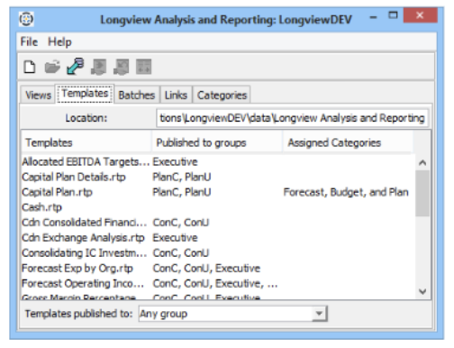 - Click OK. The Longview Analysis and Reporting dialog appears. The groups to which the template has been published appear in the Published to groups column.