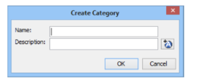 Field Description Name Enter a name for the category. You can use all characters except for the following: backslash ( \ ), forward slash ( / ), apostrophe ( ’ ), double quotation marks ( “ ), comma ( , ), left brace ( { ), and double brackets ( [[ ) or ( ]] ). Description Enter a description for the category. You can use all characters except for the left brace ( { ). To enter descriptions in alternate languages, click the A icon beside the field. The Alternate Descriptions dialog appears, enabling you to enter descriptions for other languages enabled in your system. - Click OK. The new category appears in the list of categories.