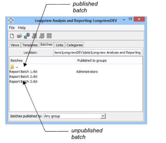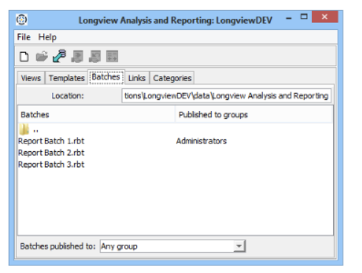 - Open the Longview Analysis and Reporting dialog, click the Batches tab. A list of batch files appears.