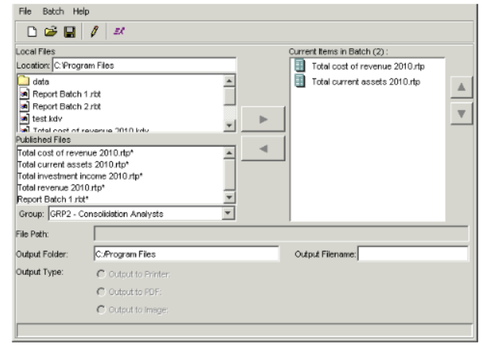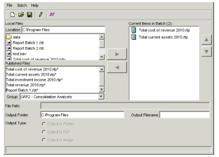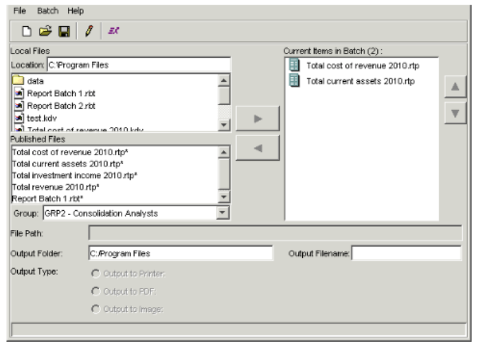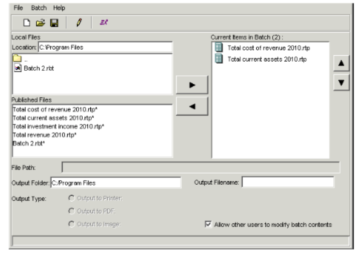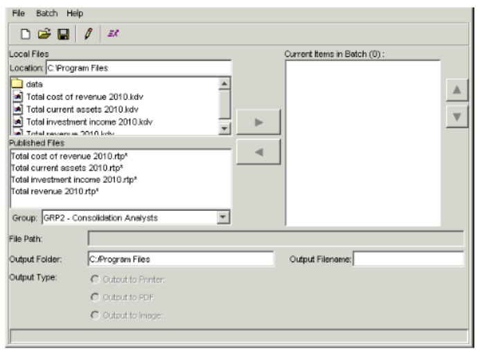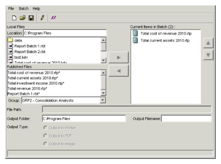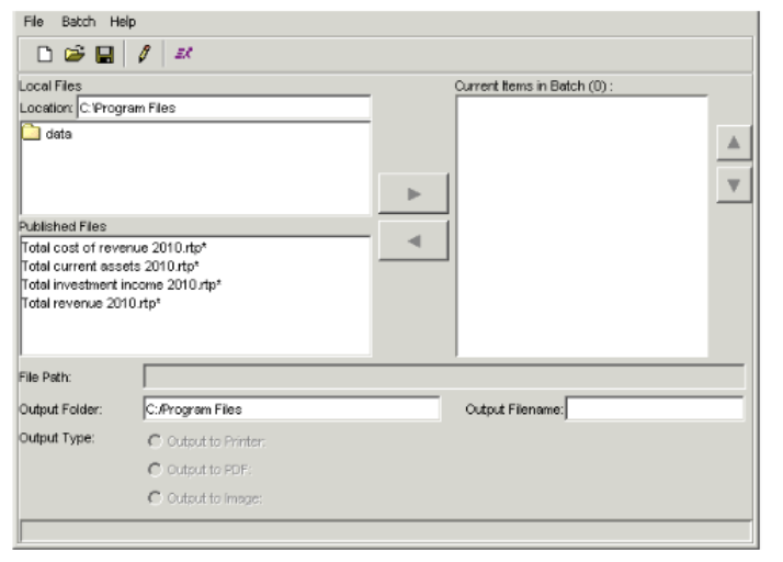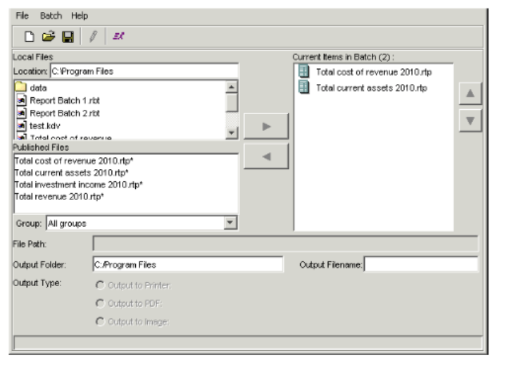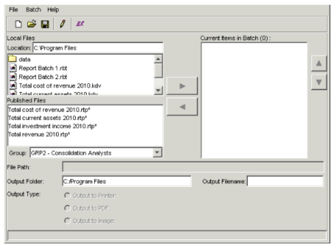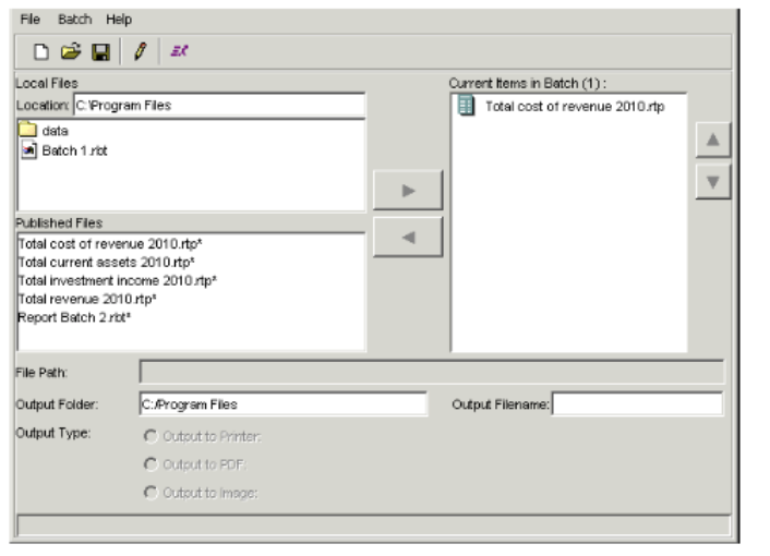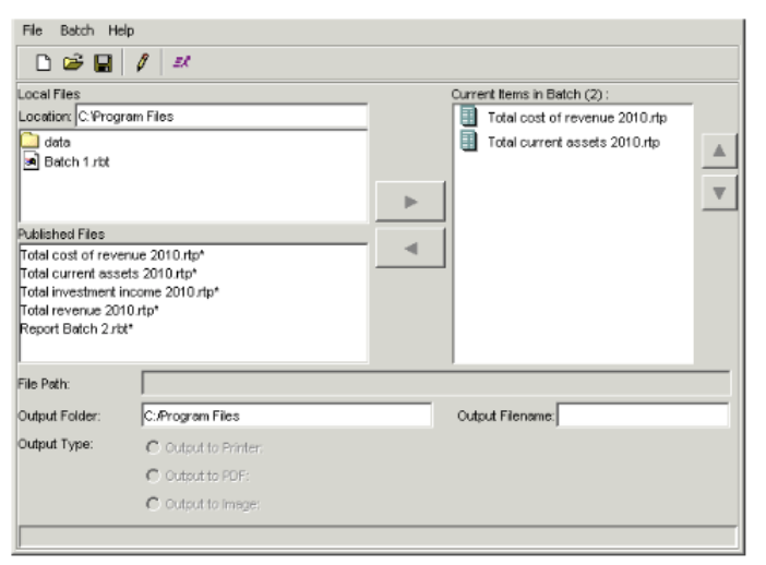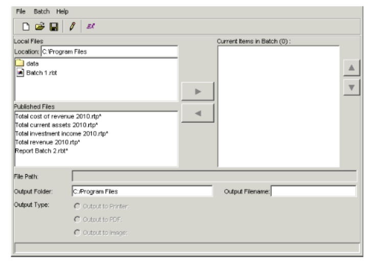 - The Local Files section lists batches you have saved locally. The Published Files section lists report templates and report batches the Report Publisher has published to the database. In either of these sections, select the batch you want to add, and click the right arrow button to move the batch to the Current Items in Batch field.