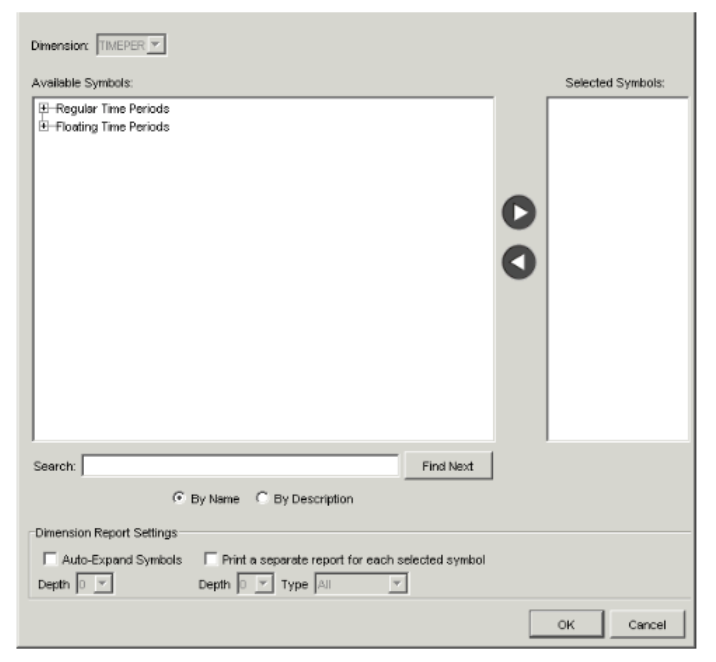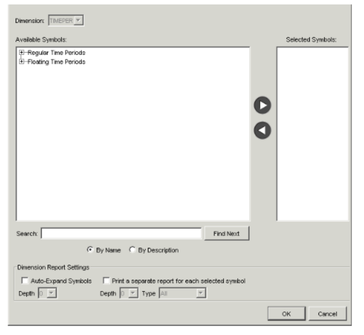 Field Description Available Symbols The available root symbols for the dimension appear in this field. When you find a symbol to use as a root symbol for that dimension, make sure the symbol is highlighted, and click the right arrow button to move the symbol to the Selected Symbols list. (If you know the name of a symbol, you can also type the name in the text field beside the Find Next button, and then click the button.) - Repeat step 5 for each root symbol to include in the report for that dimension.