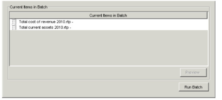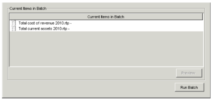 - Choose Batch > Run Batch. The Run Report Batch dialog appears, listing the reports and batches in the report batch.