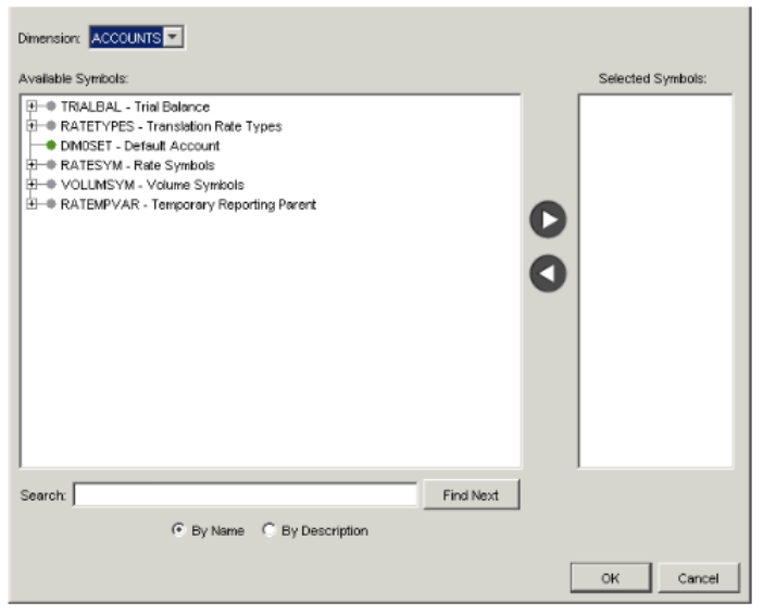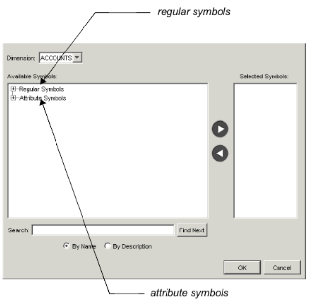 Field Description Available Symbols and Selected Symbols Find symbols in the Available Symbols list and click the arrow to move them to the Selected Symbols list. You may select as many symbols as necessary. If you want to prompt Report Users to select symbols for a particular dimension (for example, an entity) when they open the template, do not select a symbol for that dimension. You must remember however, to make sure users are allowed to select symbols for that dimension when you publish the template.