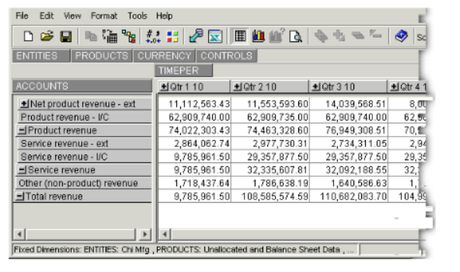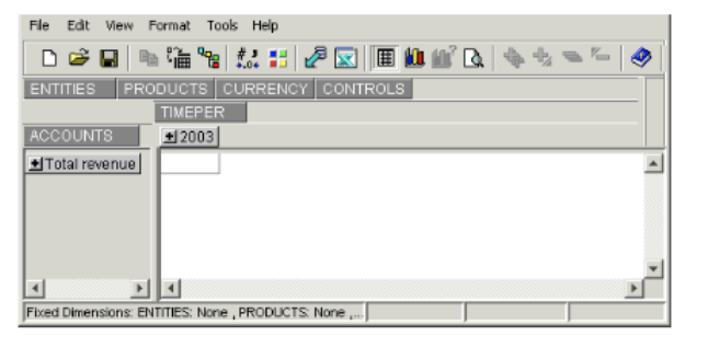 - In the view window, click and drag a dimension button to the box just above the down column. (Typically, you would select your ACCOUNTS dimension.) A small black arrow appears to indicate the correct position.