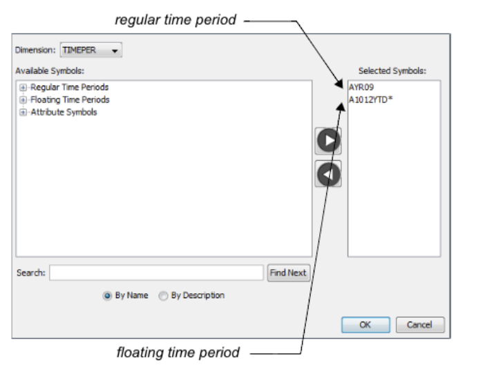 Note: To use the value of a floating time period, navigate through the time periods hierarchy in the Available Symbols list, and double-click a floating time period (indicated by an asterisk) to select it. For more information, see Using floating time period symbols.