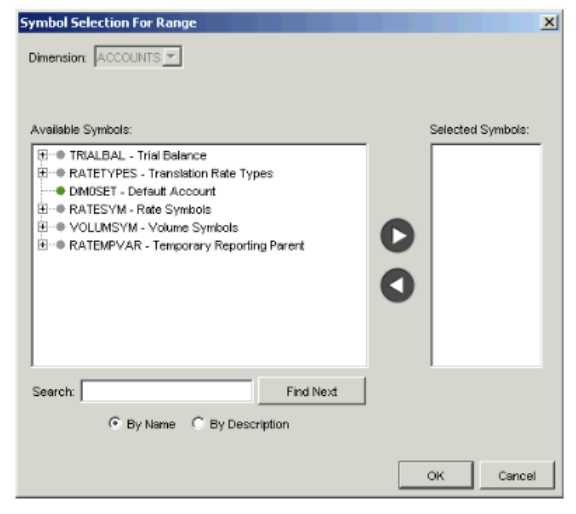 Field Description Name Type a name for the range. Description Type a description for the range. Type You have already selected Range Calculation. Ranging Dimension Select the dimension containing the parent symbols within which you want to specify ranges of symbols. - Click Add/Remove Symbols. The Symbol Selection For Range dialog appears.