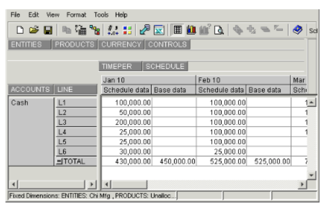 For example, the following illustration shows a simple comparison between base and schedule data for the Cash account.