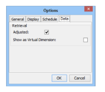 In the Data tab of the Options dialog, as described in step 8, the Show as Virtual Dimension field is available only when the Adjusted field is selected.