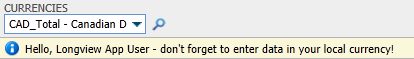 MessageBar Information, "Hello, Longview App User - don’t forget to enter data in your local currency!"