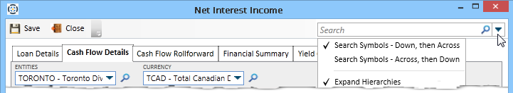 If the Search box is available in the Data Grid, Longview App users can modify the Search options within the Data Grid using the drop-down list. Longview App users cannot show or hide the Search box. Longview App users can use the Search box to search symbols only, including temporary symbols.