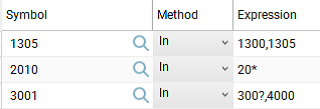 Order matters for Wildcard and Range mappings. The system imports the value based on the first matching Wildcard or Range mapping listed. Consider the order of mappings in the following map for the source file account code 10020:
