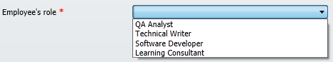 ComboBox "Employee’s role", sRole, "QA|DOC|SD|LC", "Text:QA Analyst|Technical Writer|Software Developer|Learning Consultant", "OnChange:SetRole.lvpro"