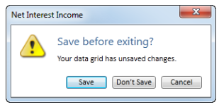 SET VARIABLE msgboxResult = SHOWADVANCEDPROMPT(Warning, "Save before exiting?", "Your data grid has unsaved changes.", "DEFAULT;Save;Save", "Don’t Save;NoSave", "Cancel;Cancel")