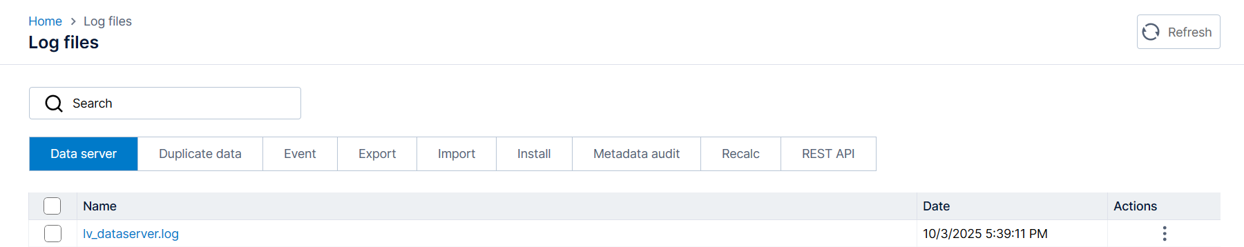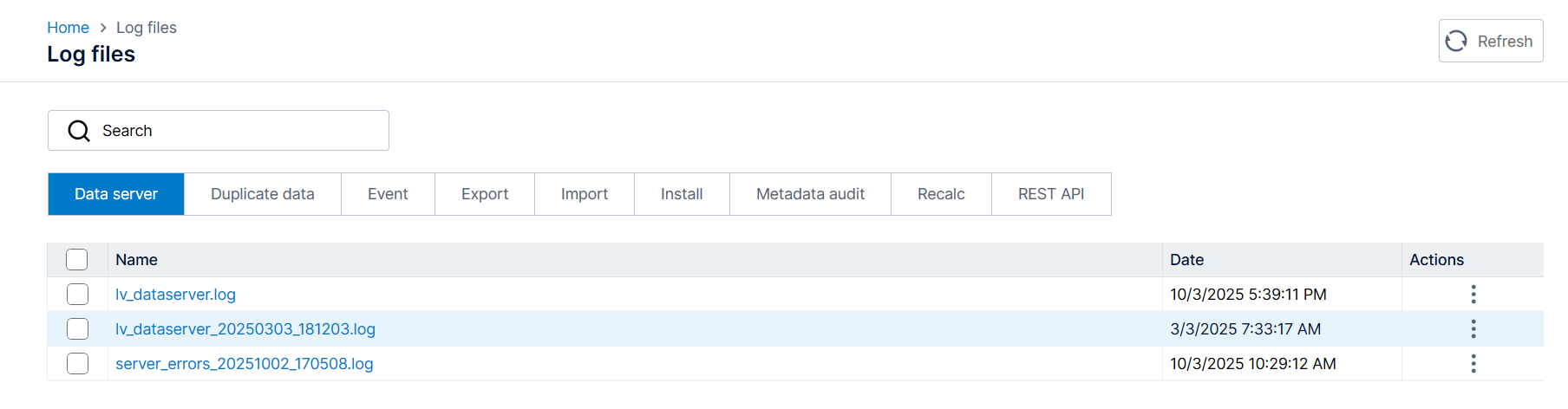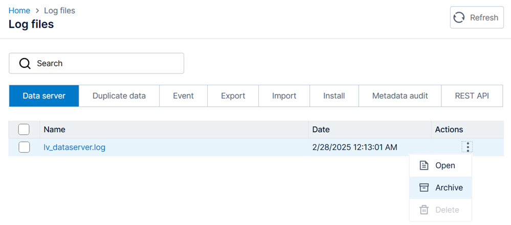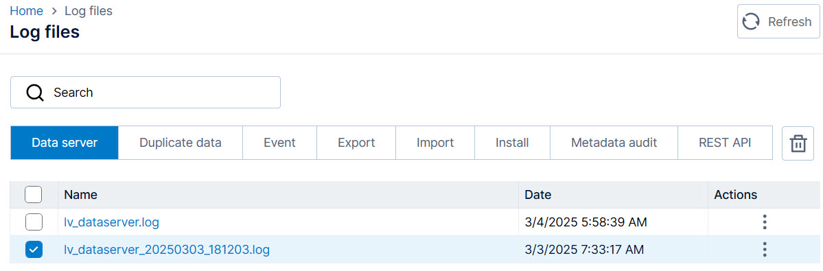 Select the lv_dataserver.log, click the More options menu (ellipsis) in the Actions column.