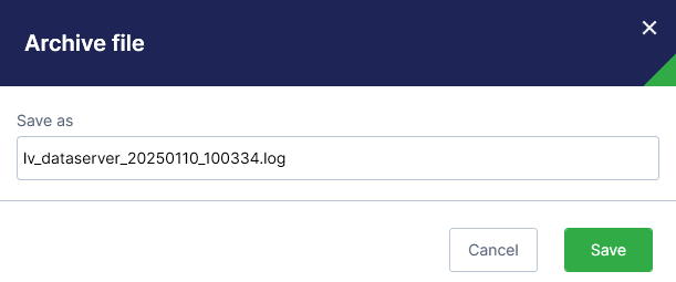 You can also archive Data Server logs, but the server_error log file cannot be archived. The archived logs are displayed on the Data Server tab. Please refer to Archiving Data Server log file below for more information.