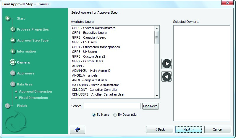 - From the Available Users list, select user IDs for this Data Area, and click the arrow keys to move them to the Selected Owners list.