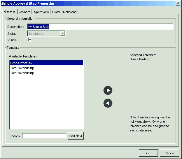 - If you want, you can associate a Longview Analysis and Reporting report template (.rtp) to each step to facilitate the viewing of approval data from the web. You can associate only one report template to a Data Area.