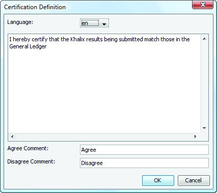 If you select the Certify data field in step 6 of Creating a Simple Process, or step 6 of Creating a Hierarchical Process, the Define Certification Definition menu item is active (otherwise, it is unavailable). This dialog is used to customize the certification message that users receive when they certify data in an approval process on the web. For more information, see Certifying data in an approval process.