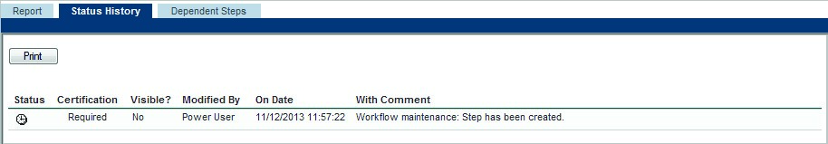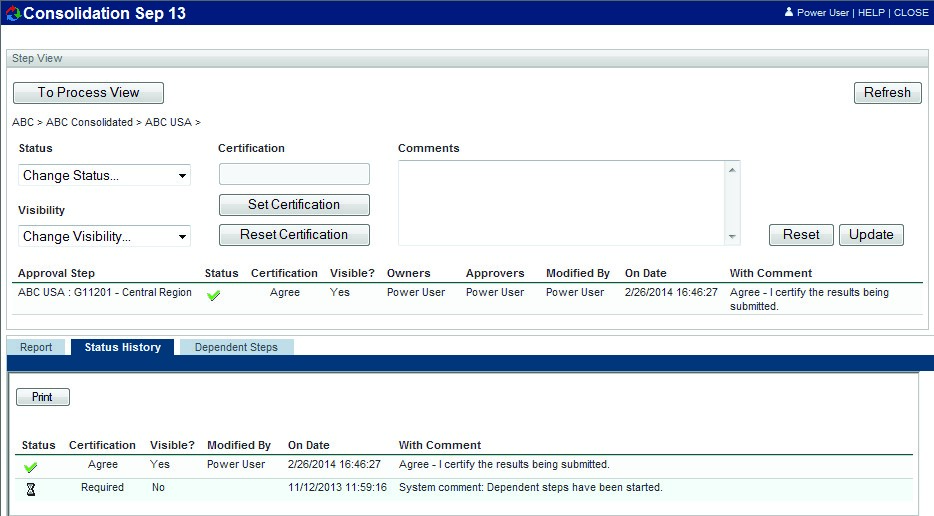 - The certification, as defined in the Certification Statement dialog, appears in the Certification field in the step view. Click the Reset Certification button to set the Certification field to “Required”.