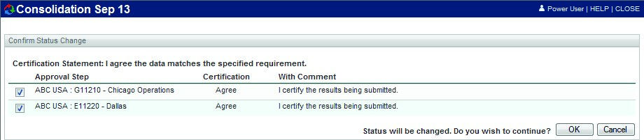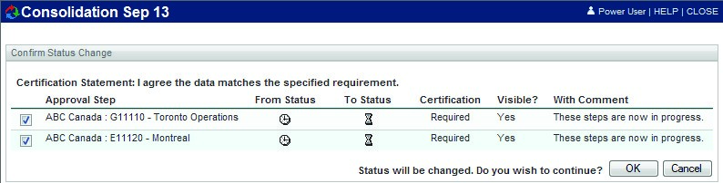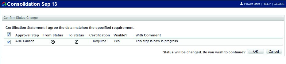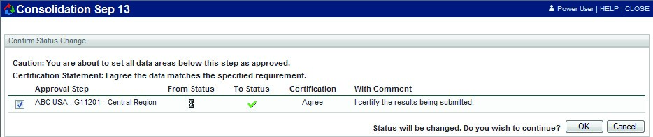 - When you are ready to submit your data, click Update. A Confirm Status Change dialog appears. The Certification Statement specified in the creation of the approval process displays above the Approval Step.