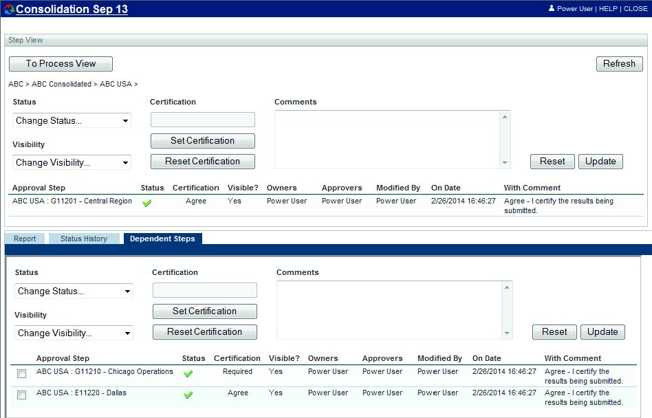 - If you are working on a hierarchical approval step, you can also certify the data of multiple dependent steps simultaneously. To do so, click the Dependent Steps tab.