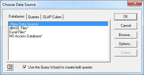 - Select <New Data Source> and click OK. The Create New Data Source dialog displays, shown below: