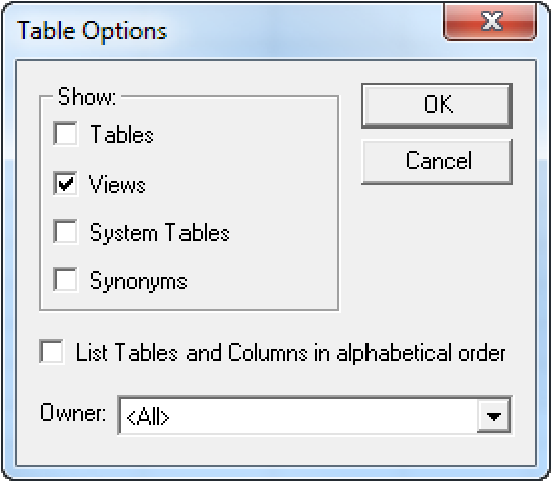 - Click Options. The Table Options dialog displays, shown below: