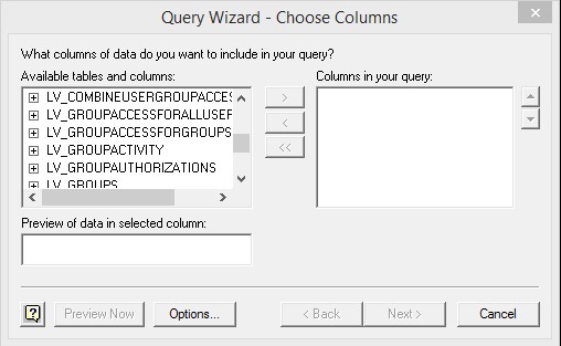 - Click OK. The Query Wizard - Choose Columns dialog displays, populated with the User Reporting Views.