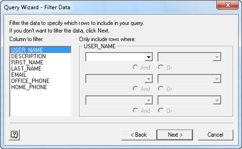 - Click Next. The Query Wizard - Filter Data dialog displays.