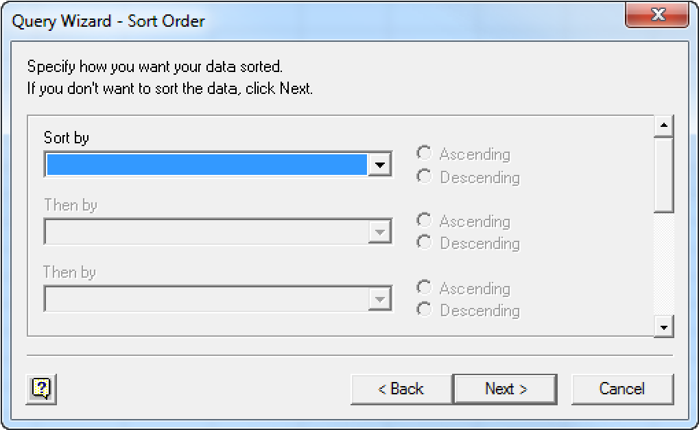- Click Next. The Query Wizard - Sort Order dialog displays.