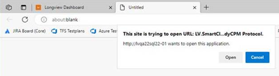 - If a user tries to launch a component from the Longview Dashboard without the Longview software for the matching LVID (Longview Identifier) being installed to their machine they will get either a blank tab page, or the following popup that will close the tab when they click Open: