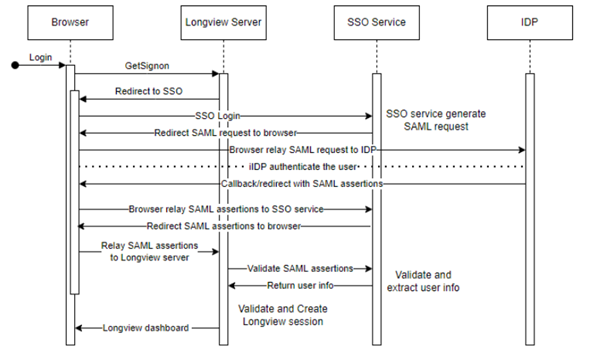 The following diagram shows you how the SAML authentication flow works with Longview: